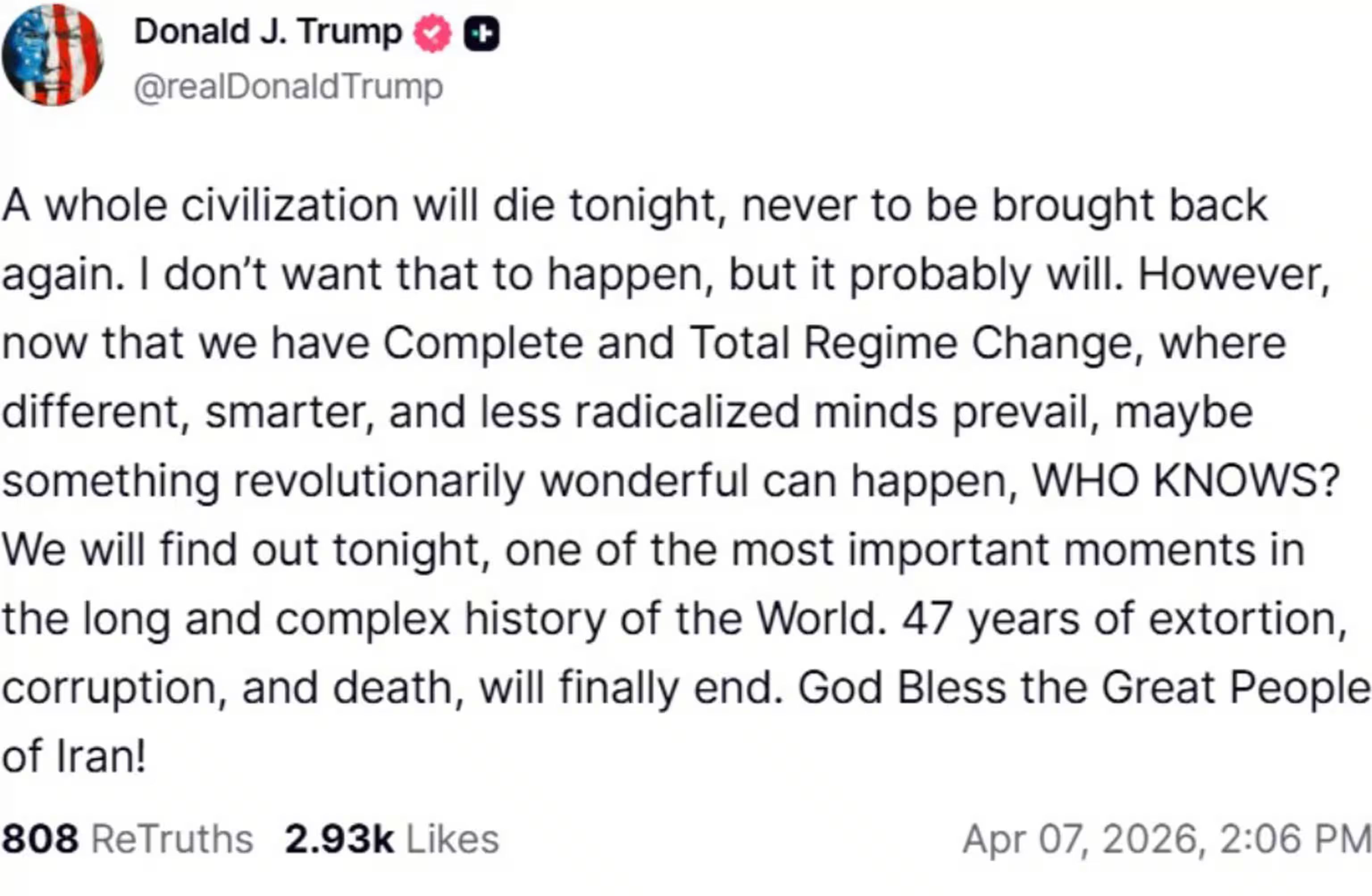 "Un'intera civiltà morirà stanotte" commentava Donald Trump sul suo social Truth poche ore prima della tregua