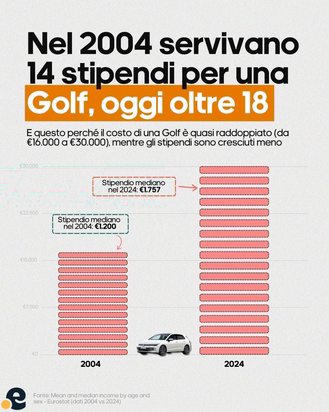 Nel 2024, il salario mensile mediano in Italia si attesta intorno ai €1.750. Ciò significa che un lavoratore medio oggi dovrebbe risparmiare 17,2 mesi di stipendio per comprare una Golf, quasi 5 mesi in più rispetto al 2004
