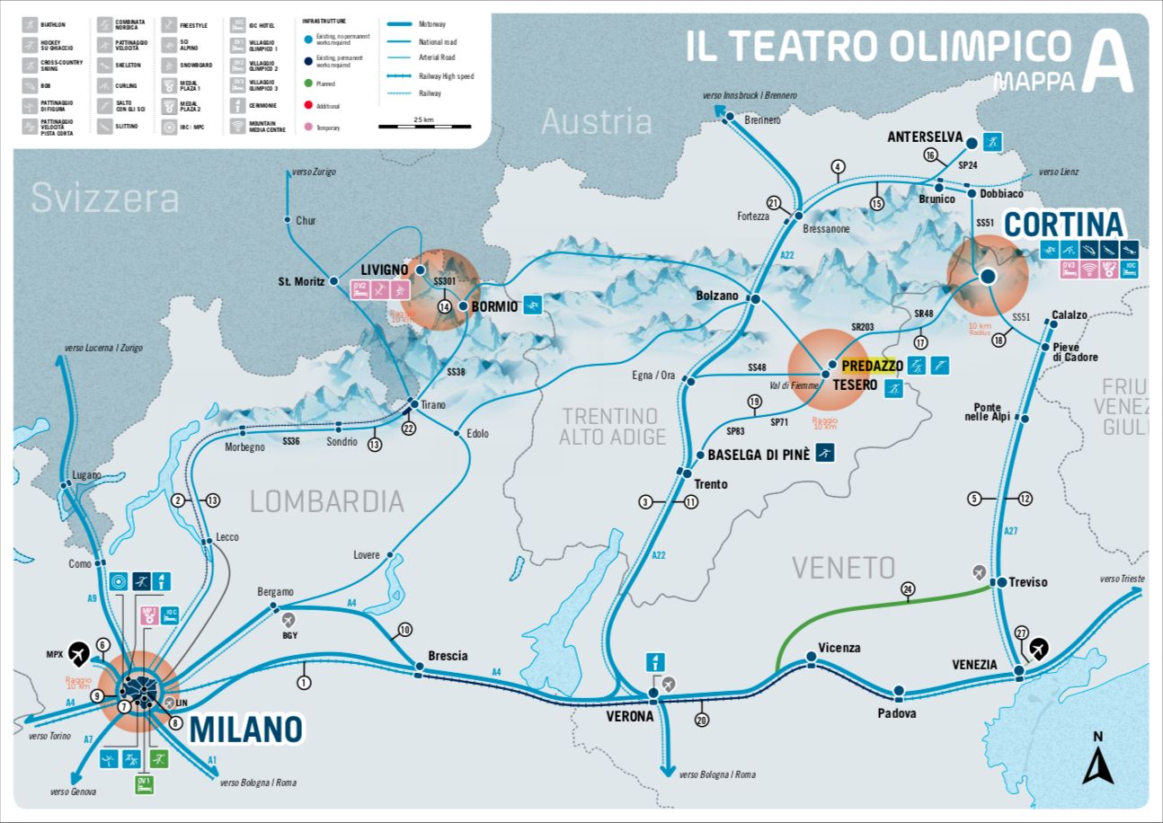 Infatti, le Olimpiadi non sono solo un grande evento sportivo, ma anche un progetto economico e infrastrutturale che coinvolge tre regioni e un'area di circa 22.000 km2.
