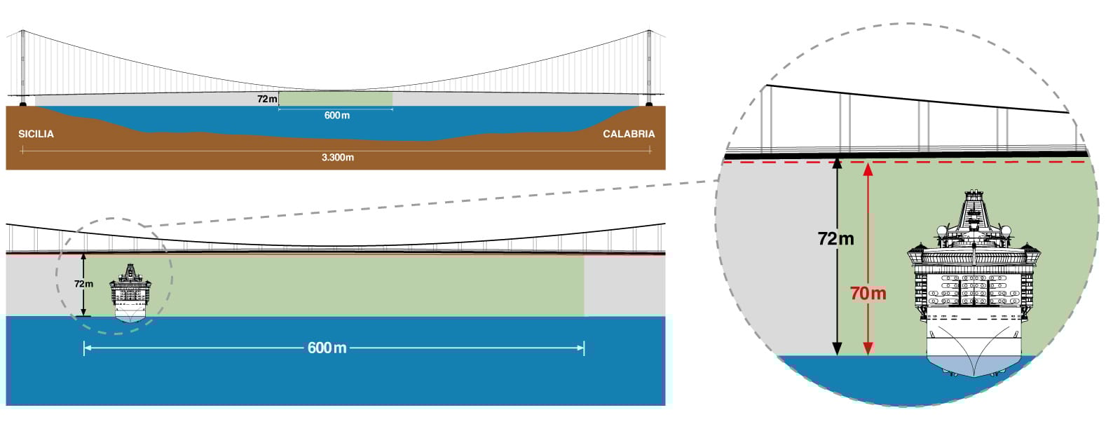 📏 La campata: con 3.300 metri sarebbe la più lunga al mondo. Oggi il record è del Ponte dei Dardanelli a Istanbul: 2.023 metri