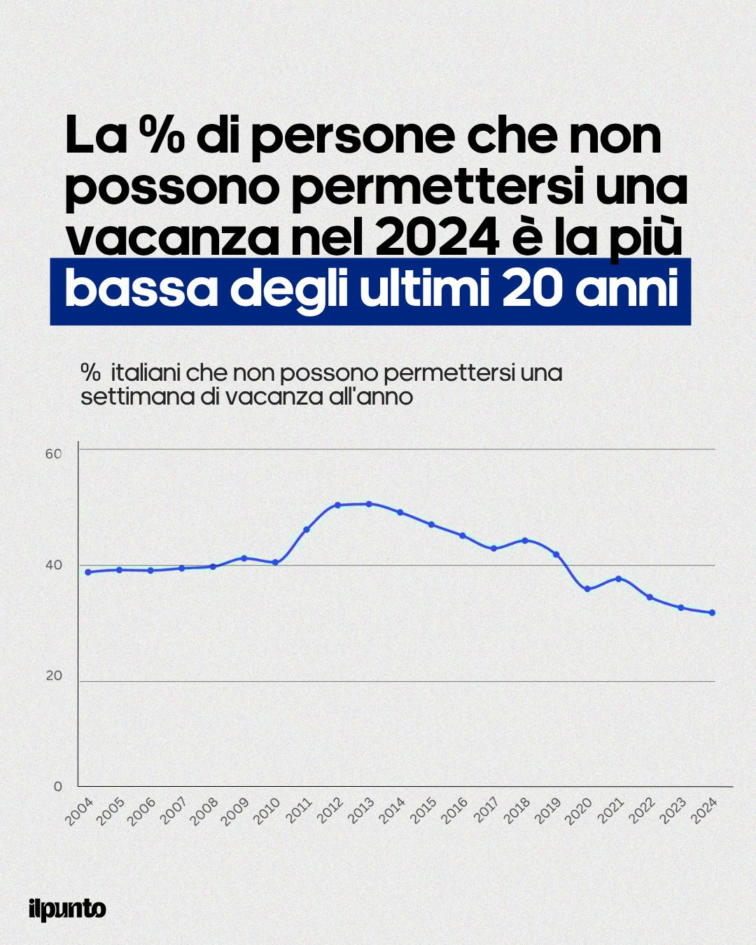 Resta il fatto che quasi un terzo della popolazione sopra i 16 anni non può ancora permettersi una settimana di vacanza, e siamo (purtroppo) ancora sopra la media europea. Tuttavia, i dati raccontano una storia di progressivo recupero che merita di essere messa in luce.